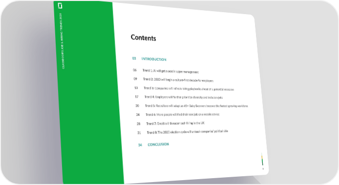 TRENDS 2020 Contents JOB & HIRING 03 INTRODUCTION GLASSDOOR'S 06 Trend 1: AI will get a seat in upper management 09 Trend 2: 2020 will begin a culture-first decade for employers 13 Trend 3: Companies will refresh hiring playbooks ahead of a potential recession 17 Trend 4: Employers will further prioritize diversity and inclusion jobs 20 Trend 5: Recruiters will adapt as 65+ Baby Boomers become the fastest-growing workforce 24 Trend 6: More people will find their next job on a mobile device 28 Trend 7: Brexit will threaten tech hiring in the UK 31 Trend 8: The 2020 election cycle will unleash companies’ political side 34 CONCLUSION 2