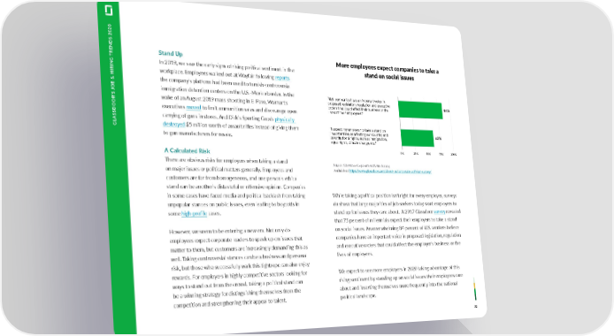 TRENDS 2020 Stand Up More employees expect companies to take a In 2019, we saw the early signs of rising political sentiment in the stand on social issues workplace. Employees walked out at Wayfair following reports the company’s platform had been used to furnish controversial JOB & HIRING immigration detention centers on the U.S.-Mexico border. In the “U.S. companies have an imporant voice in wake of an August 2019 mass shooting in El Paso, Walmart’s proposed legislation, regulation and executive 84% orders that could affect their business or the executives moved to limit ammunition sales and discourage open lives of their employees.” carrying of guns in stores. And Dick’s Sporting Goods physically destroyed $5 million worth of assault rifles instead of giving them “I expect my employer to take a stand on GLASSDOOR'S important issues affecting our country and to gun manufacturers for resale. constitutional rights, such as immigration, 62% equal rights, climate change, etc.” A Calculated Risk 0% 25% 50% 75% 100% There are obvious risks for employers when taking a stand Source: Glassdoor Corporate Activism Survey, on major issues or political matters generally. Employees and available at https://www.glassdoor.com/about-us/corporate-activism-survey/ customers are far from homogeneous, and one person’s ethical stand can be another’s distasteful or offensive opinion. Companies in some cases have faced media and political backlash from taking While taking a political position isn’t right for every employer, surveys unpopular stances on public issues, even leading to boycotts in do show that large majorities of job seekers today want employers to some high-profile cases. stand up for issues they care about. A 2017 Glassdoor survey revealed that 75 percent of millennials expect their employers to take a stand However, we seem to be entering a new era. Not only do on social issues. An overwhelming 84 percent of U.S. workers believe employees expect corporate leaders to speak up on issues that companies have an important voice in proposed legislation, regulation matter to them, but customers are increasingly demanding this as and executive orders that could affect the employer’s business or the well. Taking controversial stances can be a business and personal lives of employees. risk, but those who successfully walk this tightrope can also enjoy rewards. For employers in highly competitive sectors looking for We expect to see more employers in 2020 taking advantage of this ways to stand out from the crowd, taking a political stand can rising sentiment by standing up on social issues their employees care be a winning strategy for distinguishing themselves from the about and inserting themselves more frequently into the national competition and strengthening their appeal to talent. political landscape. 32